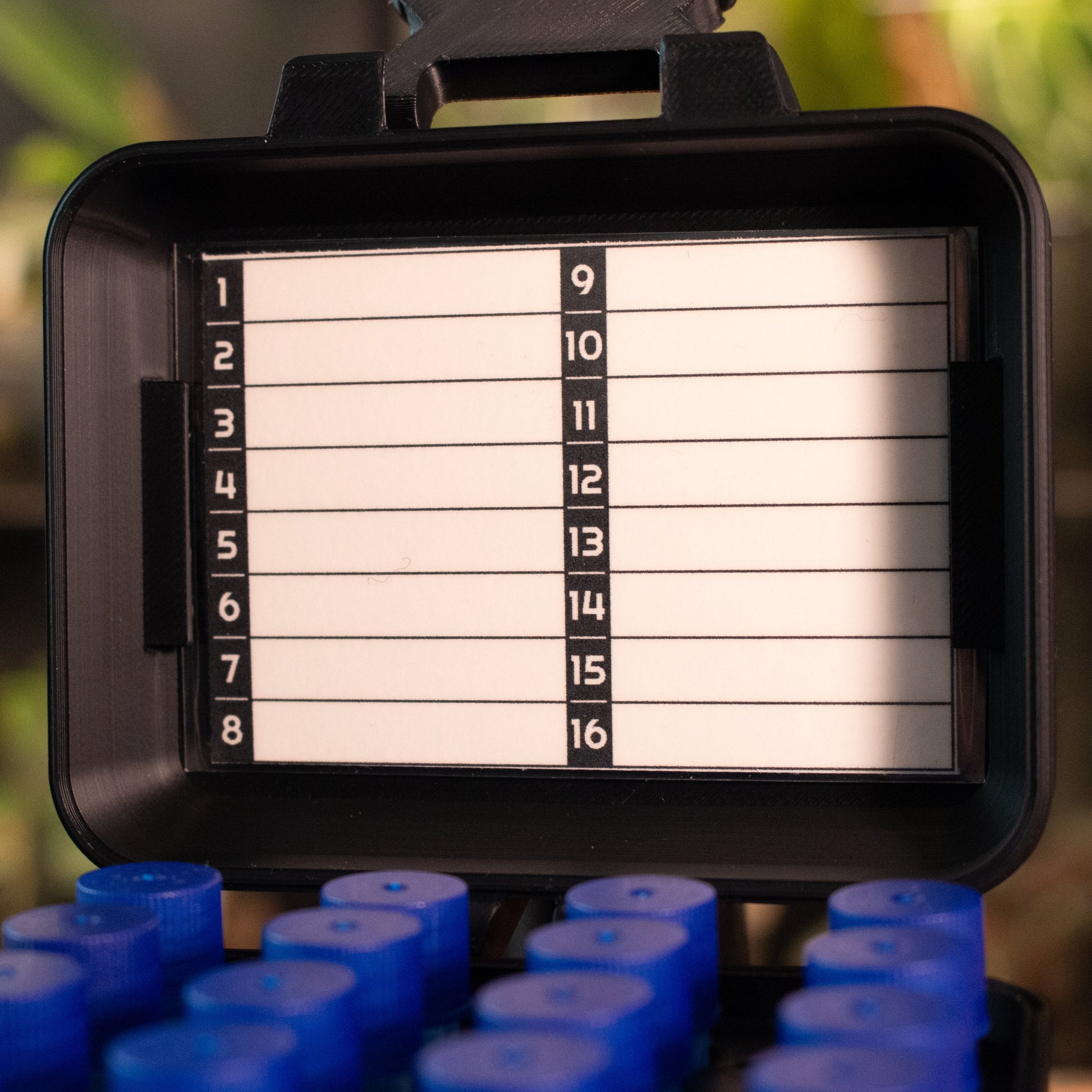 Designed by Rooted on the Peaks, the Pollen Freezer Organizer provides a compact and efficient solution for storing plant pollen in airtight 2mL tubes. Each tube is securely held in numbered slots, which correspond to a reusable reference list conveniently placed inside the lid.